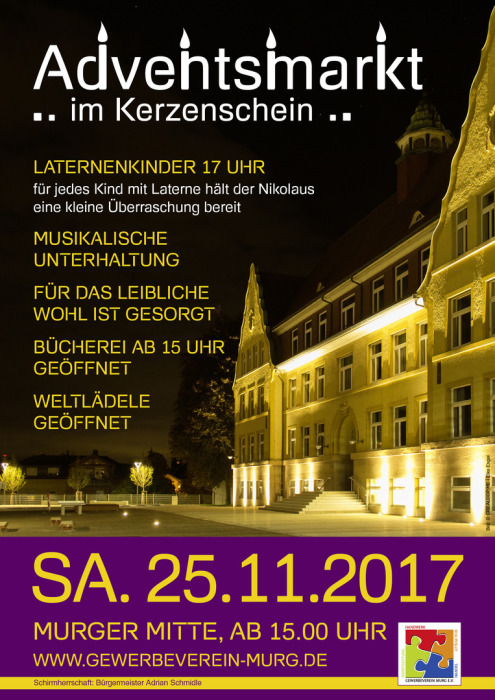 Lassen Sie sich von 15.00 bis 21.00 Uhr auf dem weihnachtlich dekorierten Murger Adventsmarkt verzaubern. Wir, der Gewerbeverein Murg, laden Sie und Ihre Familie ganz